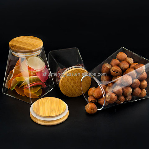 Gran oferta, tarro de almacenamiento de alimentos sellado de vidrio de borosilicato alto redondo de fondo cuadrado transparente resistente al calor con tapa de Bambú