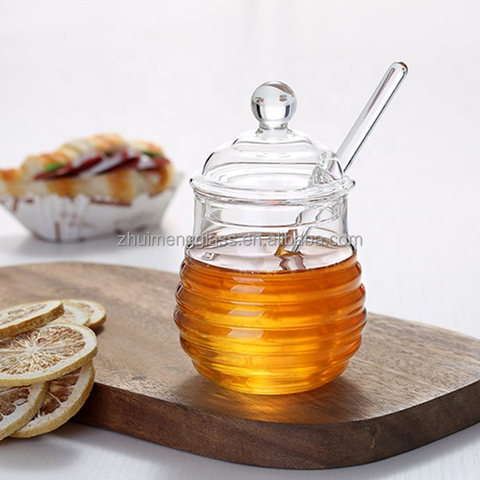 Tarro de almacenamiento de miel de vidrio de borosilicato alto para cocina transparente hecho a mano único creativo con tapa y cuchara